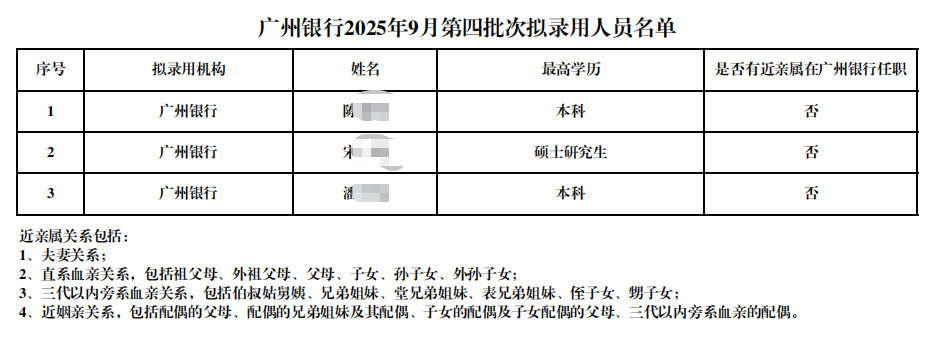2025年廣州銀行9月第四批次擬錄用人員公示