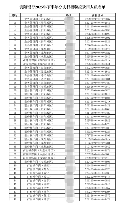 貴陽銀行2025年下半年分支行招聘工作已結(jié)束,根據(jù)公平、公正、公開的原則,按照考生綜合成績排名,經(jīng)黨委會(huì)審議通過,本次招聘擬擇優(yōu)錄用49人,現(xiàn)將人員名單予以公示。
